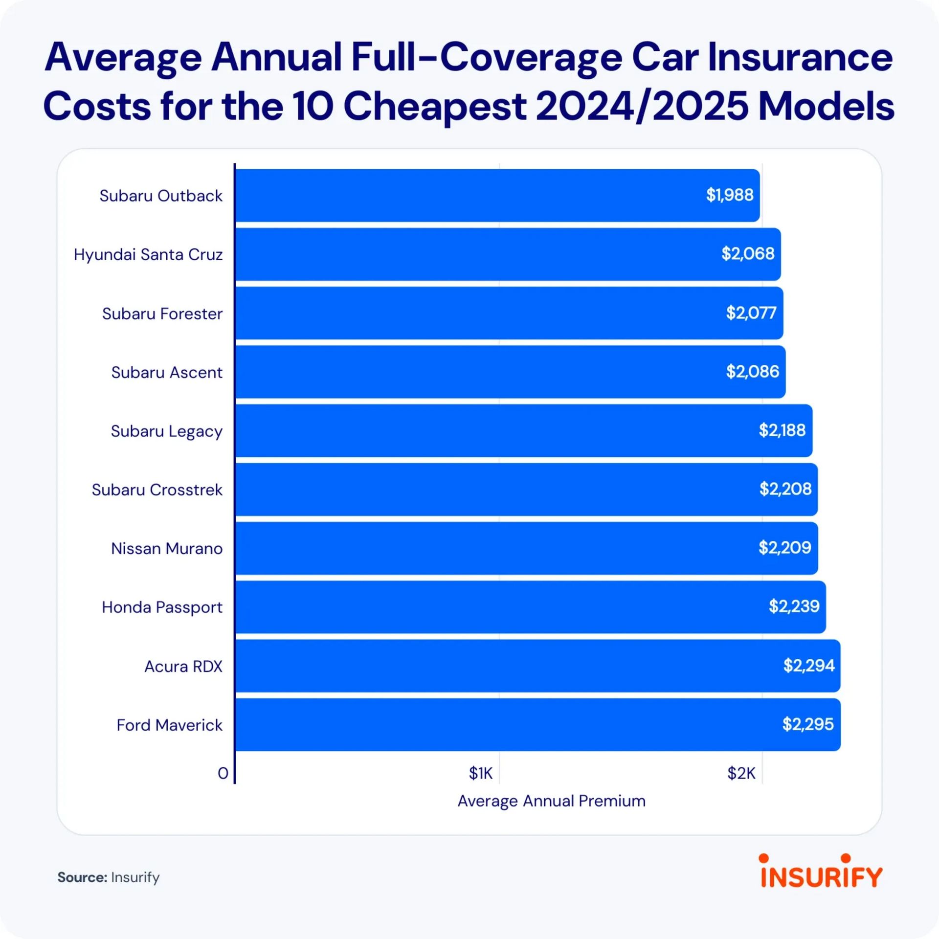 The standout: Subaru dominates the list of the cheapest new models to insure (five vehicles in the top 10).