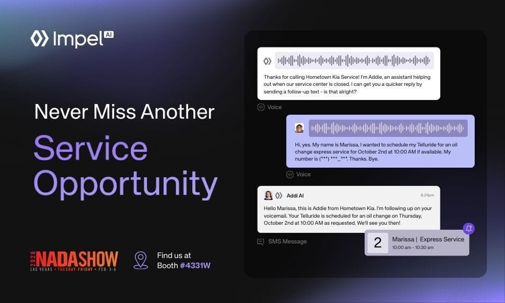 Impel Service AI with Voice AI removes the friction holding fixed ops back with VIN-specific outreach based on customer driving behavior, missed-call capture, and instant appointment scheduling by text, email, chat, and phone.