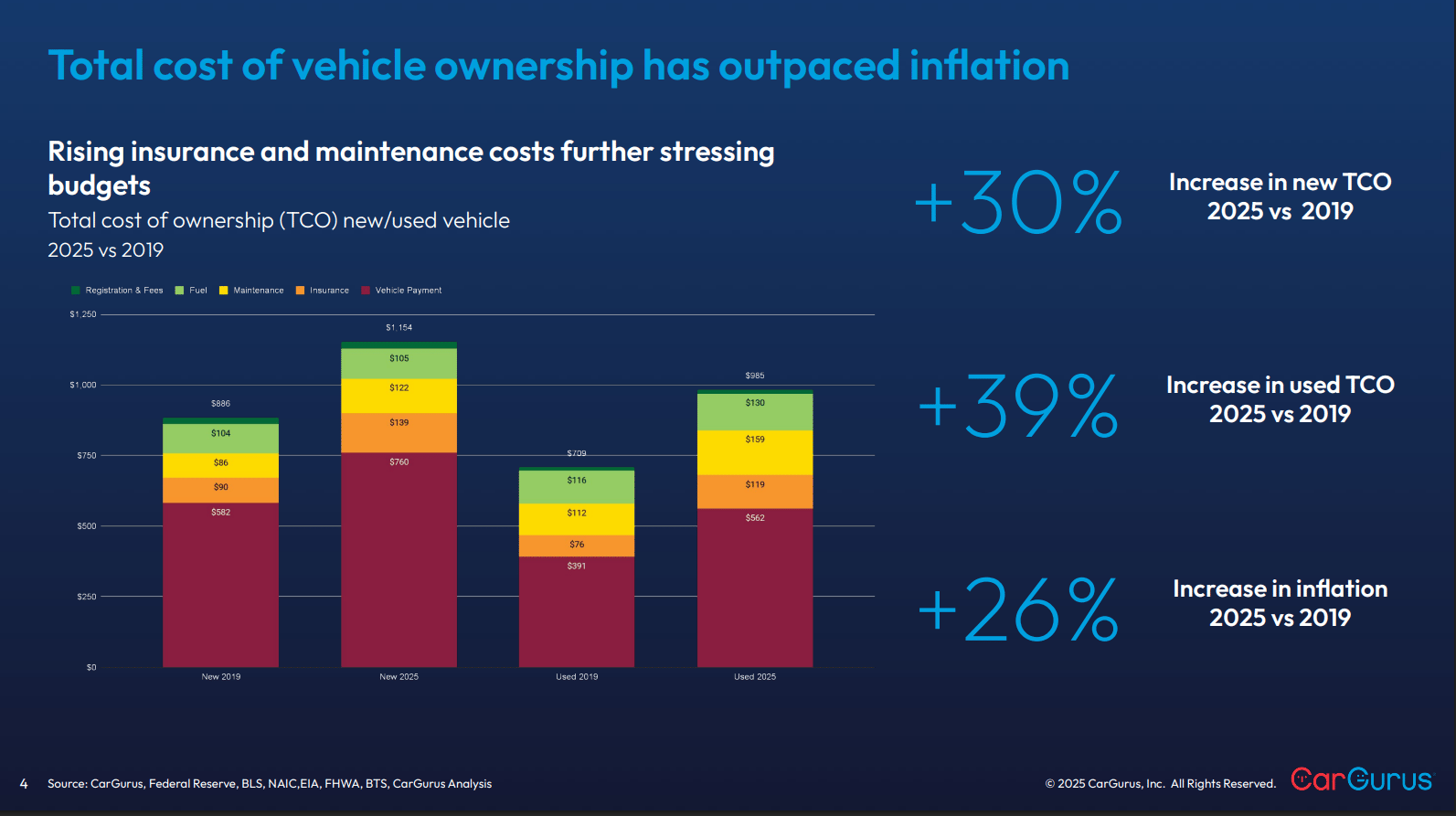 Since 2019, total cost of ownership (TCO) has climbed faster than overall inflation (26%),with new-vehicle TCO up about 29% and used-vehicle TCO up about 36%.