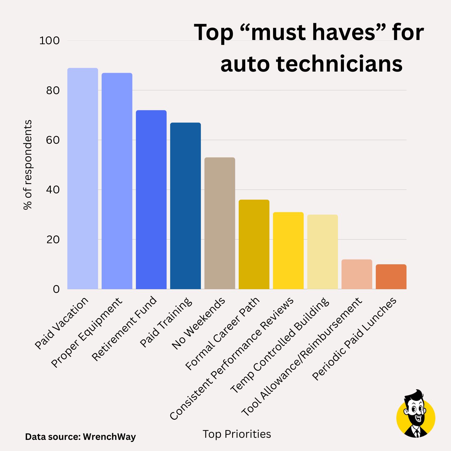 Most techs say paid training is a must-have (67%). But the problem is that only 51% feel they’re actually getting that, per WrenchWay.